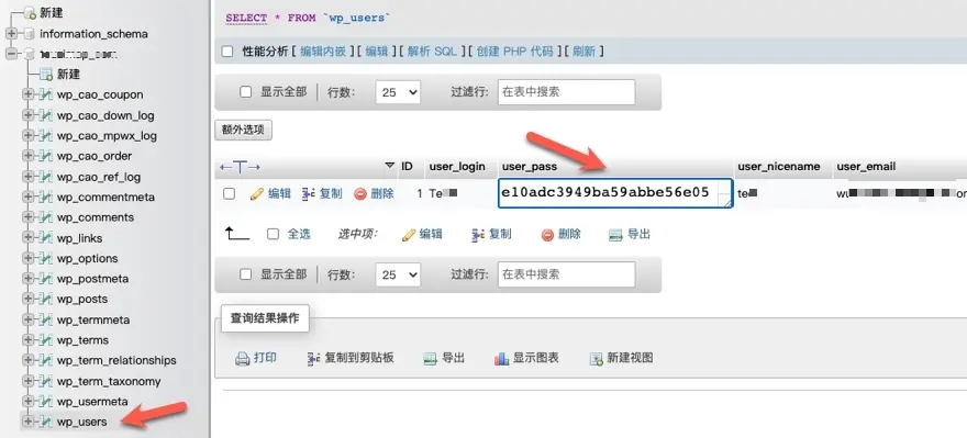 在数据库管理界面中,找到名为"wp_users"的数据表,然后将密码字段更改为新密码。